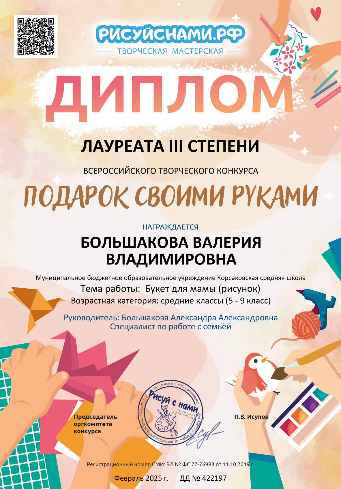 Специалист отделения социальной помощи и срочных социальных услуг БУОО"ЦСОН Корсаковского района", с детьми клуба «Светлячок» приняли участие во всероссийском творческом конкурсе «Рисуй с нами!». Показали свои умения в двух номинациях: «Зимние забавы» и «Подарок своими руками». Каждая работа была уникальна и наполнена теплом и вдохновением. Все участники получили заслуженные награды. Среди них есть диплом победителя.